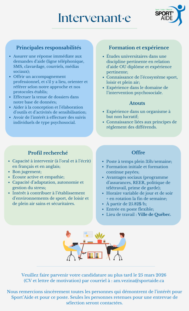 Sport’Aide, une organisation indépendante et sans but lucratif vouée à promouvoir et favoriser des environnements sains et sécuritaires en sport, loisir et plein air, est à la recherche de perles rares pour compléter son équipe !