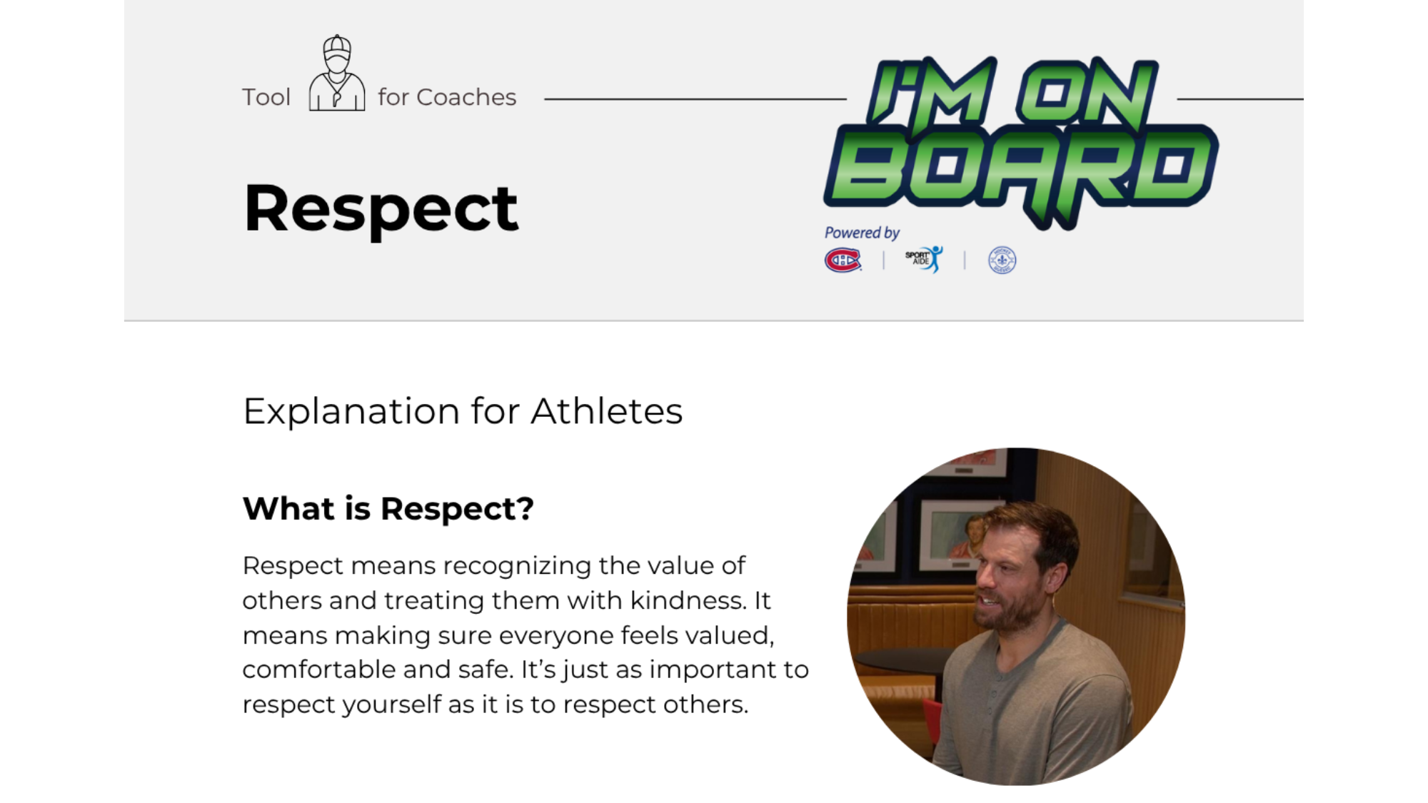 I’m on Board is a project run in collaboration with the Montreal Canadiens and Hockey Québec to promote a hockey culture in Quebec that combines well-being and performance. The Montreal Canadiens, Hockey Québec and Sport’Aide believe that the success of this program depends on teaching life skills such as respect, mutual support, inclusion and emotional management. These skills are at the heart of successful, cohesive hockey teams, but they ALSO enable people to flourish in other spheres of life, such as school, home and work.