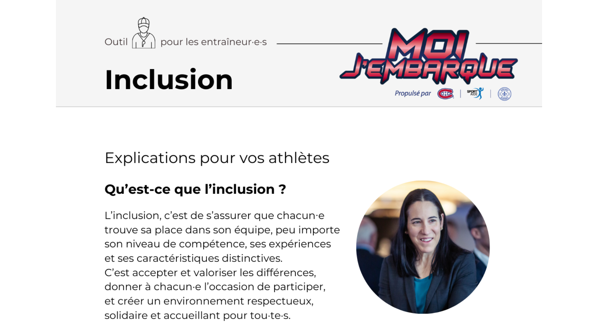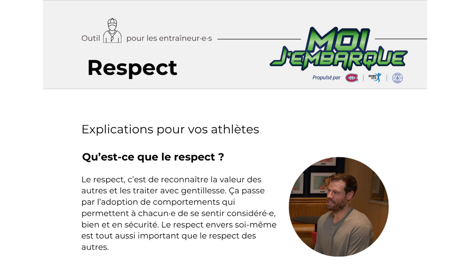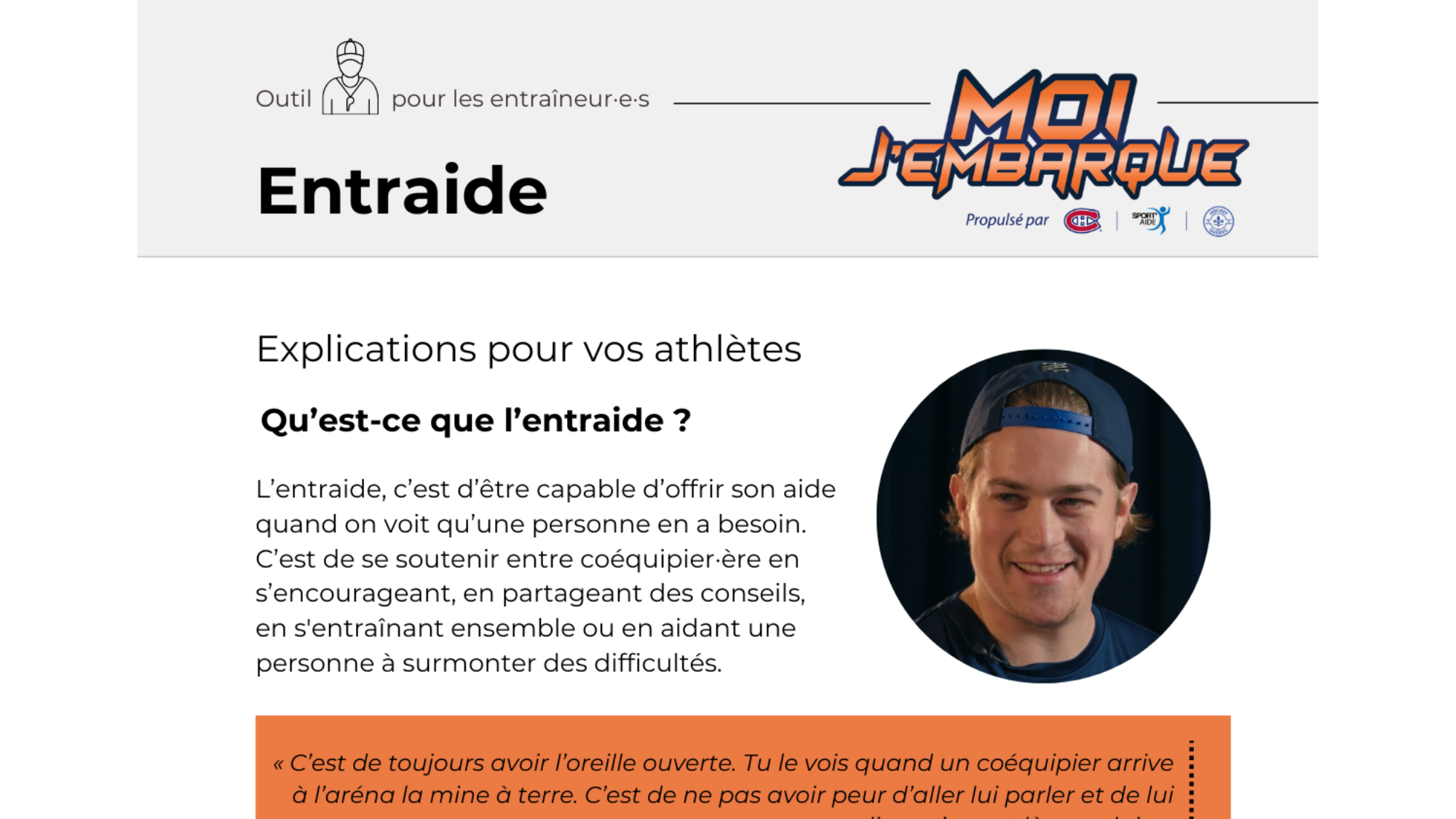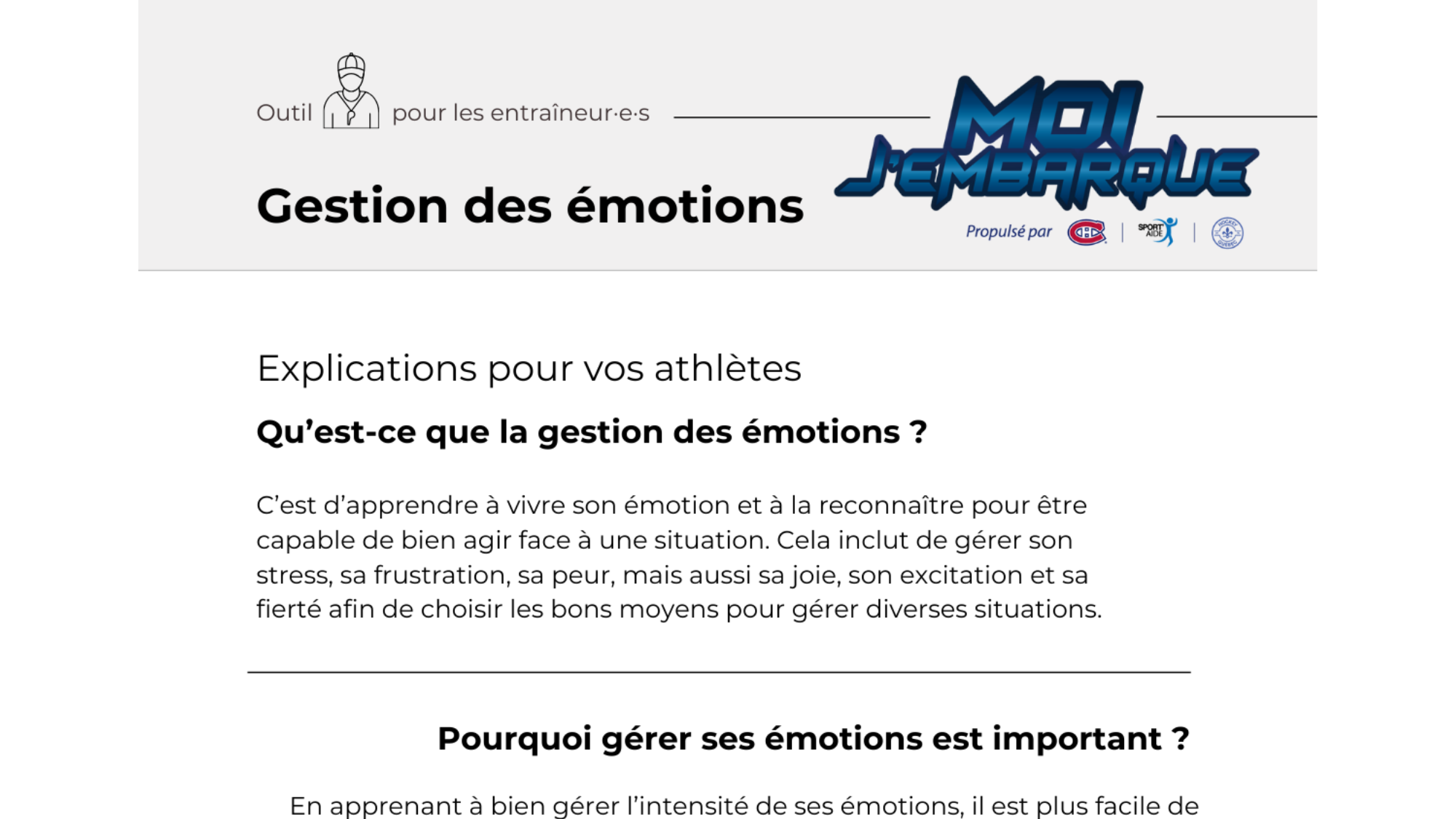 Moi j’embarque est un projet mené en collaboration avec Les Canadiens de Montréal et Hockey Québec dans le but de promouvoir une culture du hockey au Québec qui conjugue bien-être et performance. Les Canadiens de Montréal, Hockey Québec et Sport’Aide croient que la réussite de ce programme passe par l’enseignement d’habiletés de vies, comme le respect, l’entraide, l’inclusion et la gestion des émotions. Ces habiletés sont au cœur des équipes de hockey performantes et cohésives, mais elles permettent AUSSI de s’épanouir dans d’autres sphères de la vie, comme à l’école, à la maison et au travail.