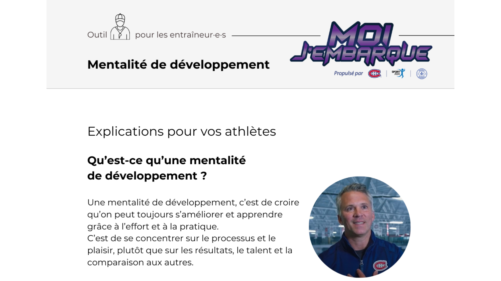 Le programme regroupe des contenus développés pour les entraîneur·e·s et les parents afin de leur permettre d’enseigner des habiletés de vie facilement et rapidement au quotidien. Un atelier est offert aux entraîneur·e·s pour leur expliquer comment enseigner ces habiletés à l’aide des contenus du programme. Ces entraîneur·e·s ont aussi accès à un accompagnement individualisé après l’atelier pour faciliter et adapter leurs interventions dans leur milieu.